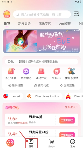 打开代购类应用后,点击底部的“发现”选项,即可进入发现板块页面。
