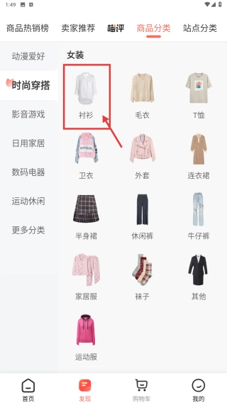 在时尚穿搭板块里,挑选衬衫类别,浏览相应的商品清单。
