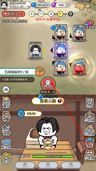 关卡挑战以村东头作为核心场景,每个关卡都对应着不同的魔性对手,选择技能时需要适配对手的特性,而技能无CD的设定则让策略选择更加自由,既保留了轻度策略的特点,又放大了爽玩的体验。