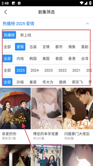 在剧集筛选界面,设置好筛选条件后,找到《亲爱的你》这部剧,点击进入它的播放页面。