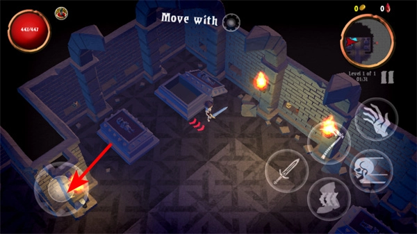 进入关卡后,你可以借助左侧的移动轮盘来控制角色行动,先朝着场景里的交互点移动过去,借此熟悉场景的布局和基础的操作逻辑。