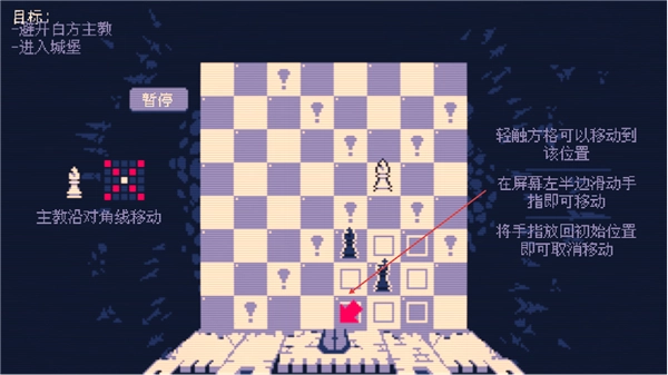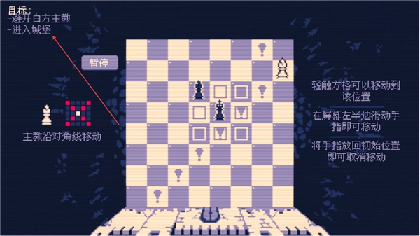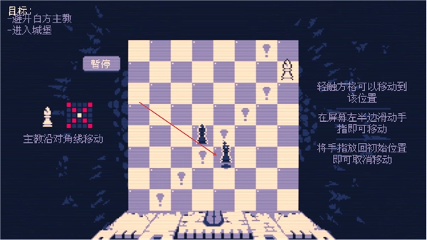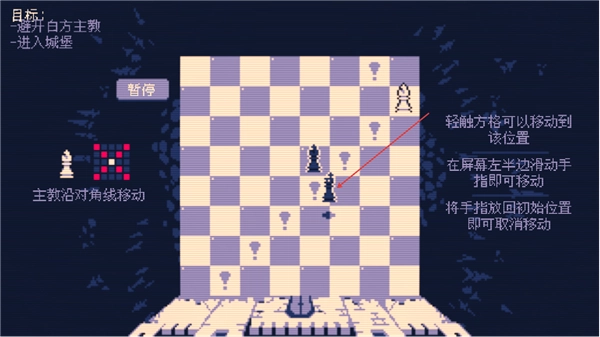 游戏的目标很明确,就是要让我方的主教成功进入城堡。主教的移动方式是沿着对角线进行的,你只需要轻触想要移动到的格子,主教就会移动到对应的位置了。