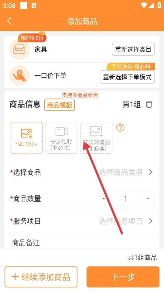 在【添加商品】页面,按照实际需求上传商品的相关资料,待商品信息填写完整后,点击【下一步】按钮。