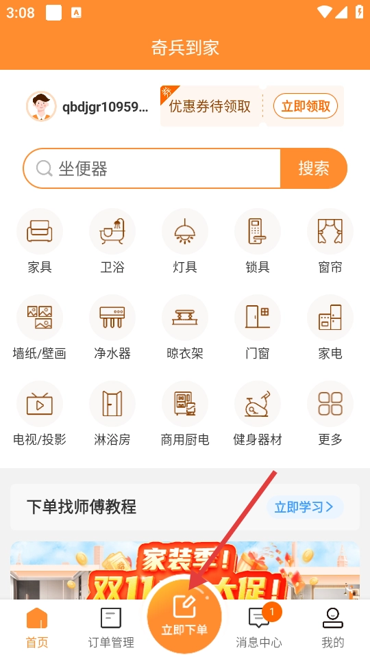 在【奇兵到家】首页,点击底部的【立即下单】按钮,即可进入发布订单页面。