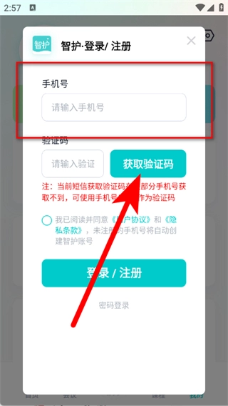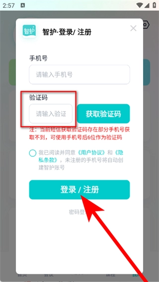 输入你收到的短信验证码,勾选相关选项后,点击登录注册按钮,即可完成注册流程。