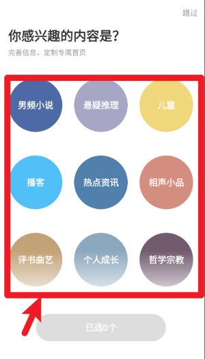 1初次使用时,会出现一个兴趣选择页面,根据个人偏好进行勾选,这有助于平台推荐更加符合您需求的音频资源。
