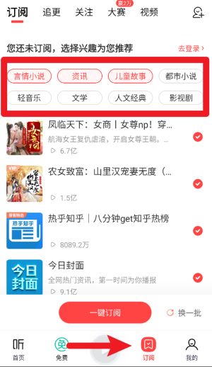 3、点击下方的“订阅”按钮,可以选择您喜欢的小说、资讯、儿童故事等内容,然后点击“一键订阅”即可快速完成添加。