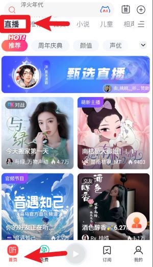 2、首页默认显示“直播”页面,用户能够查看当前正在进行的直播内容,点击封面后即可进入直播间收听。