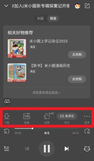 4该播放界面功能丰富,不仅支持用户根据个人喜好调节播放倍速,还提供了下载音频的选项,极大地方便了用户的使用。点赞和评论功能让用户能够更直接地表达自己的感受,增强了互动性。而查看相关推荐商品并支持边听边购的设计,则巧妙地将娱乐与购物结合在一起,为用户提供了一站式的便捷体验,满足了多样化的需求。