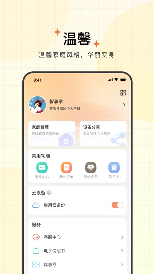 1、智享家可以展示并管控同一用户拥有的各类智能设备,解决用户在搭建智能家庭、使用智能设备和服务过程中所遇到各种问题,让智能家庭组建真正“零门槛”。