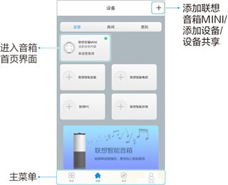 在主菜单点击 I-app_device(设备),您可以添加联想音箱MINI或其它智能设备。添加联想音箱MINI后,您可进入音箱首页进行相关操作设置。
