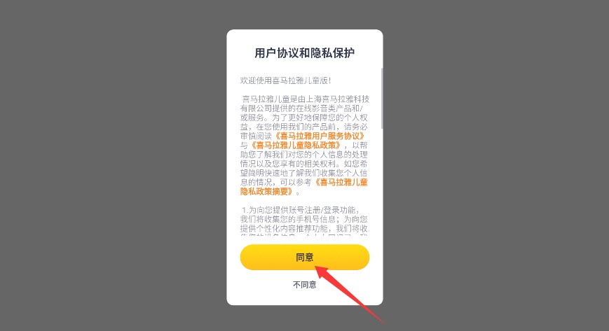1首次使用时,请先阅读平台的服务条款和隐私政策,确认无误后点击同意按钮进入应用。