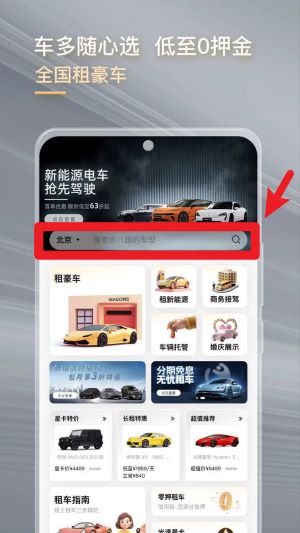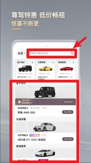 1、启动应用程序,进入主界面后可以选择所在城市,搜索想要租赁的车型或通过浏览推荐分类来快速挑选车辆。