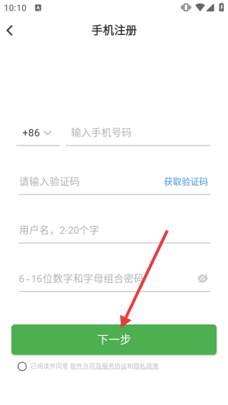 3、在手机注册页面,输入手机号、验证码、用户名和密码,勾选协议后点击【下一步】完成注册。
