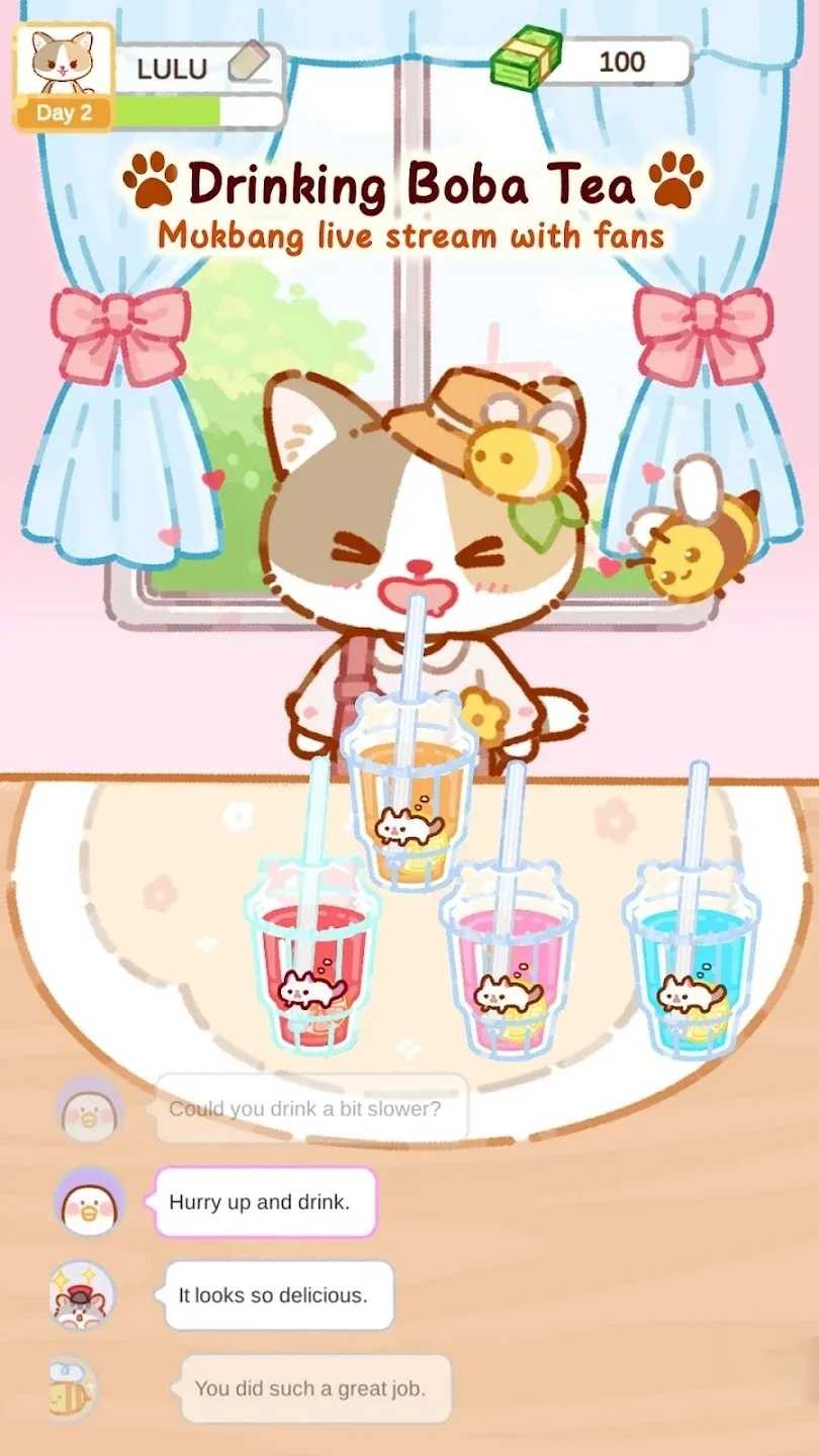 在游戏中加入了直播元素,你可以在制作奶茶的同时与观众互动。你可以自由装扮超级可爱的猫咪形象,探索更多新食材,解锁丰富的配料,调制出令人赞叹的奶茶口味。扮演一名奶茶店老板,学习制作各种独特口味的珍珠奶茶,吸引顾客,提高店铺的口碑和排名。购买食材,根据配方制作珍珠奶茶,并通过调整口味、甜度等参数来满足顾客的需求。