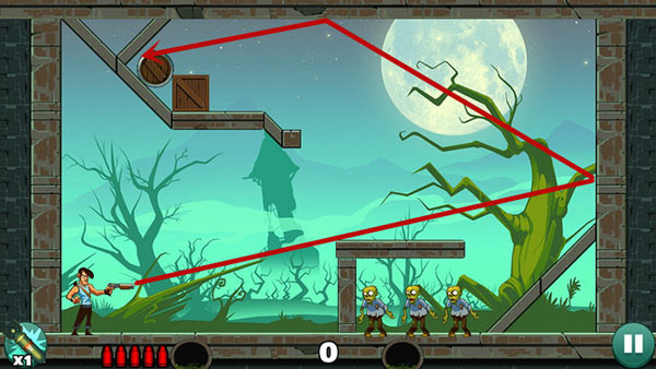 这关过起来最容易,没什么技巧,直接瞄准僵尸射击即可,如果想一发子弹过关不妨多试试不同的角度