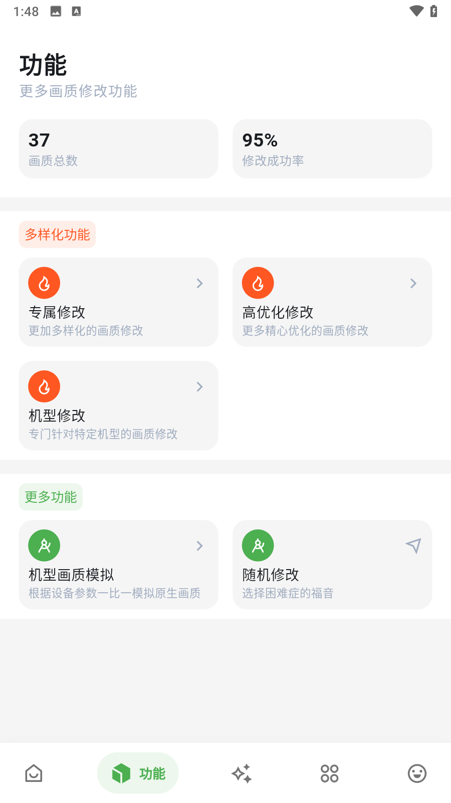 3、在第2个功能板块中,拥有着5个功能,其中就有专属修改、机型画质模拟、机型修改、高优化修改、随机修改等选项;