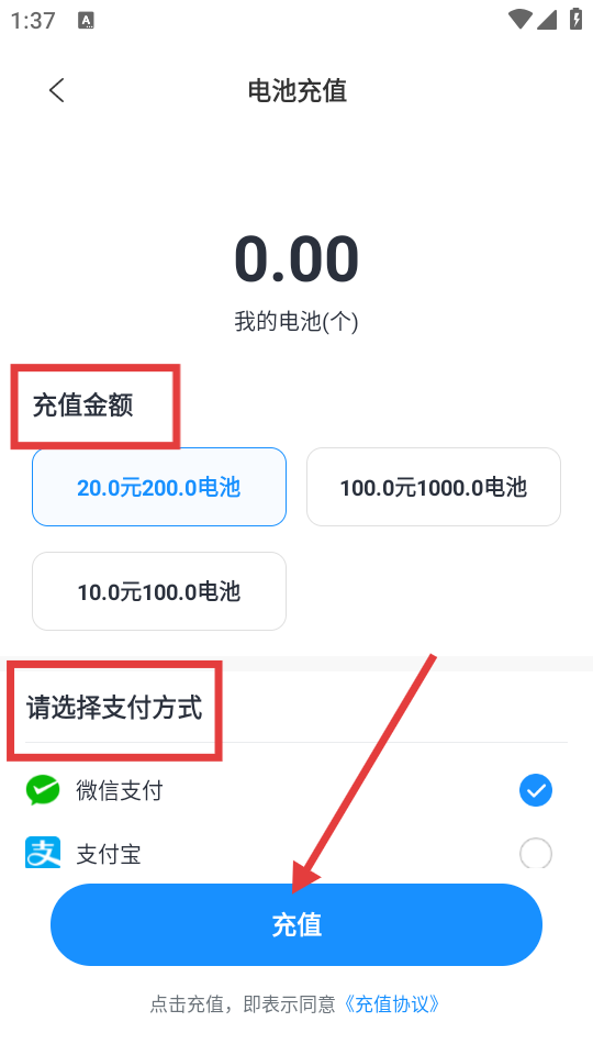 4、充值页面选择充值金额,选择支付方式,点击蓝色【充值】,完成电池充值流程。