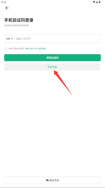 2、在登录界面,输入手机号码,勾选同意协议后选择验证码登录或密码登录。