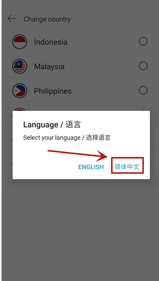 3、点击国旗图标将地区切换到新加坡,然后点击继续,在出现的对话框中选择简体中文即可完成设置。