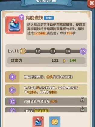 5、磁铁,这个机关虽然削弱了,但是也是一个万金油机关,和爆燃是替换关系,玩法师、射手的时候基本优先爆燃,玩战士时候优先磁铁。升10级就足够了,5级可以控抗性,10级可以增加范围。