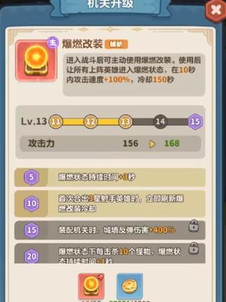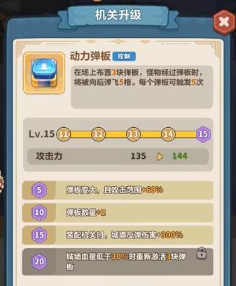 4、能量手环,是一个增伤很强力的机关,绝对伤害的数值非常高。优先5级,之后在所有机关都达到基本等级以后再考虑升10级,虽然机关的增伤都是乘法计算,但是3次攻击后的下一次攻击增加30%伤害,等于4次攻击增伤一次30%,平均下来不如绝对伤害的百分之一,所以10级优先级不高。