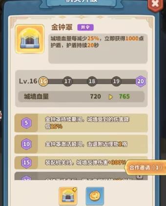 8、金钟罩,一个增加护盾并减伤的机关,数值中规中矩,全部4000的护盾量对于现在高血量的我们有些不够看,新手没有解锁红粉机关时候可以带一带,不推荐优先升级。