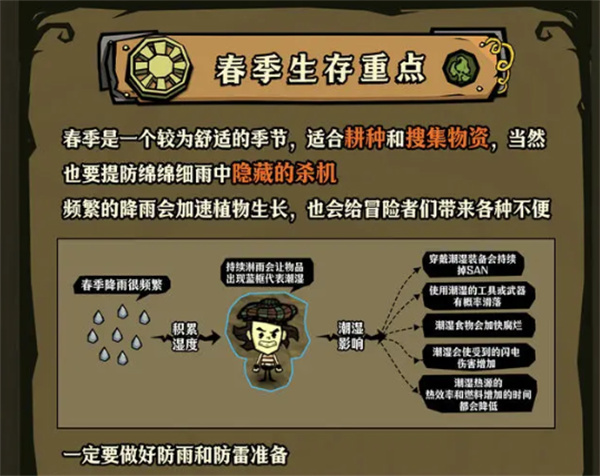 春季是个颇为舒适的季节,适宜耕种与搜集物资。不过,得警惕绵绵细雨中暗藏的危机,频繁的降雨虽会加快植物生长,却也会给玩家造成诸多不便。