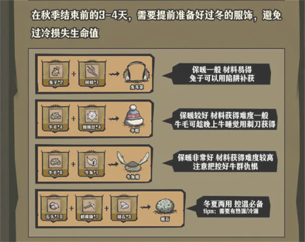 在秋季结束前的3-4天,需要提前准备好过冬的服饰,避免过冷损失生命值