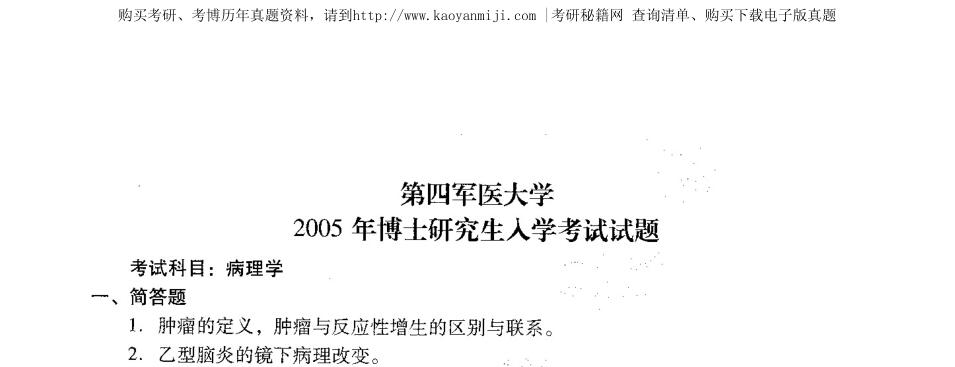 说明:本站提供的第四军医大学考博真题来源于第四军医大学研究生院,除标注有“回忆版”字样的试题外,其余均为原版扫描,权威可靠;回忆版试题由当年参加硕士研究生入学考试考生回忆,内容完整。