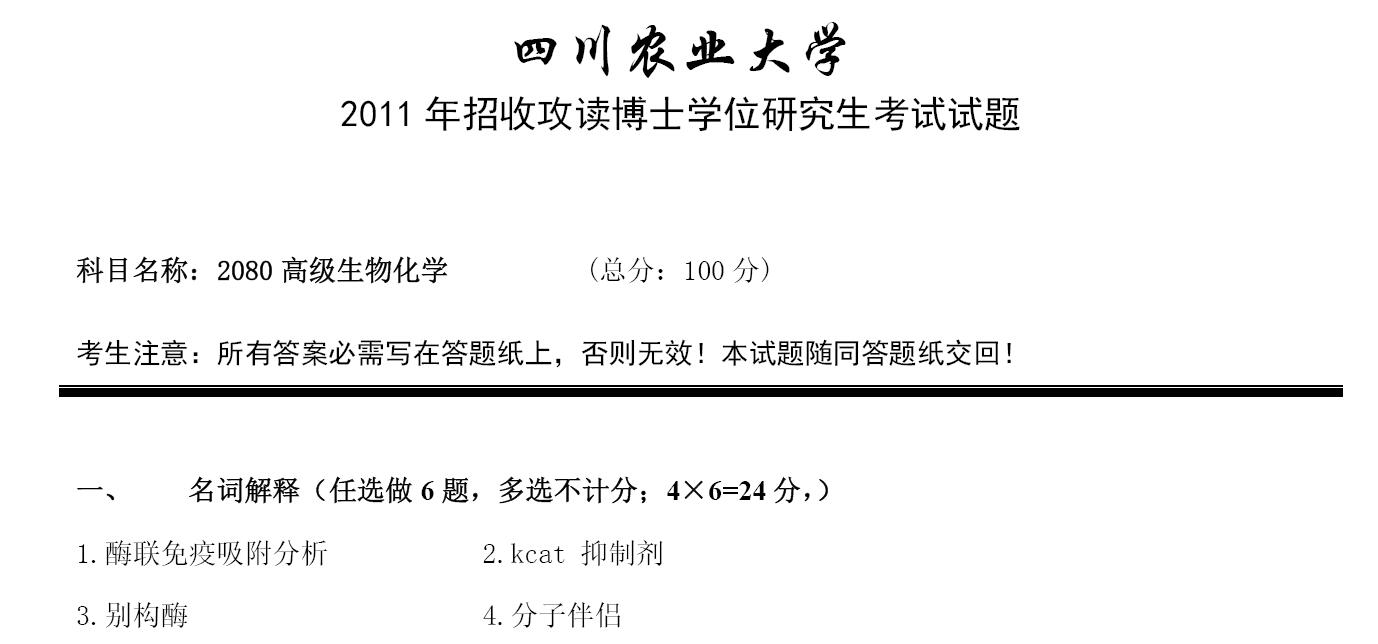说明:本站提供的四川农业大学考博真题来源于四川农业大学研究生院,除标注有“回忆版”字样的试题外,其余均为原版扫描,权威可靠;回忆版试题由当年参加硕士研究生入学考试考生回忆,内容完整。