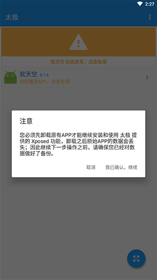 2、创建应用时间略长 耐心等待,待界面弹出注意提示时(仔细阅读),将手机返回桌面卸载钉钉,然后返回 太极 点击 我已确认继续;