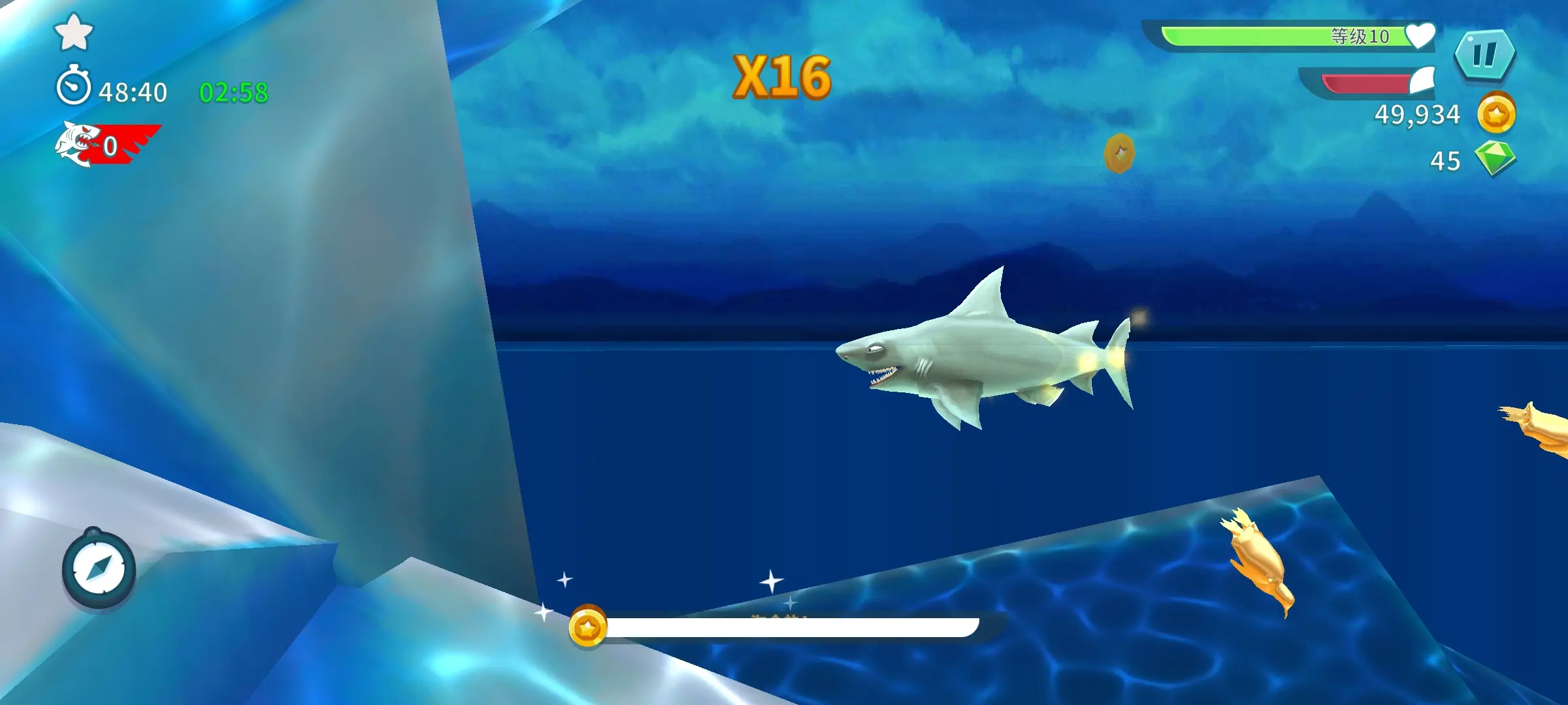 ④可汗鲨和沧龙是前期打螃蟹比较快的鲨鱼,可收集钻石;