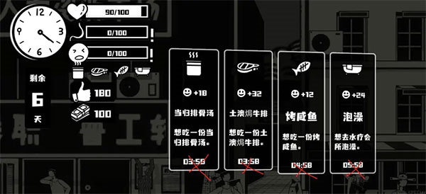 3、辛苦一天之后,你需要用一顿“丰盛”的晚餐犒劳一下五脏庙。如果角色生命值过低,不仅无法继续打工,还有可能生病。如果真的生病了,那可是一笔不小的开销。
