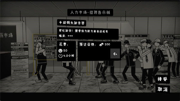 2、玩家需要前往游戏中的人力市场,承接不同的“打工”小游戏。不同的“打工”小游戏所需要的耗时、难度、给予的报酬都不同,所以玩家还是要仔细挑选一下。如果去晚了,人力市场就没有好的“日结”工作啦!
