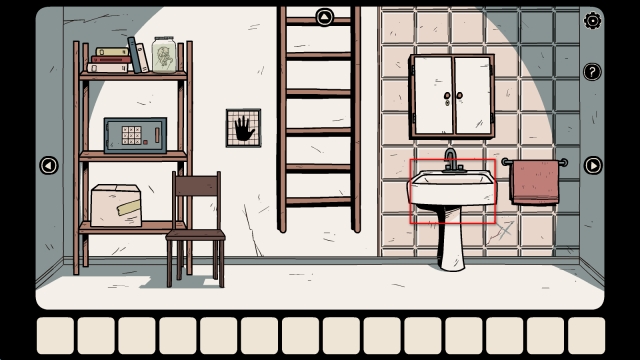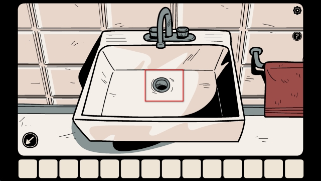 3、来到洗手池区域,查看水槽排水口,尝试用获得的工具操作,可能发现隐藏物件,为打开保险箱或其他机关做准备。