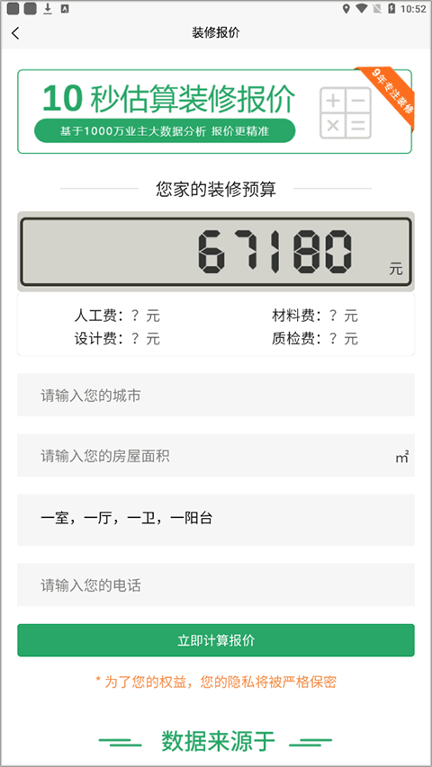 10秒算出您当地装修的价格,提前算一算,做到心中有数。