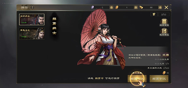 高级点将:每次点将可获得10点声望值,每30次点将必得猛将。声望值达到1000时可招募任一阵营的猛将。