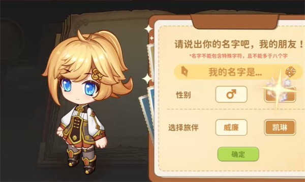 玩家首先要输入一个名字,接着挑选一位伙伴,点击确认按钮就能进入游戏了。