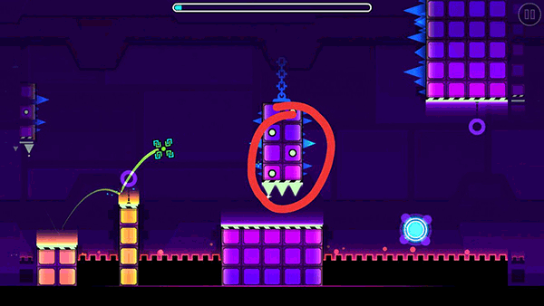这种场景中玩家要想过关的话就需这样做,等方块跳上第一个桩子时不要点击右下角,一旦点击的话方块就会碰到上方悬挂的钉子,不点击方块就会向下落到比较矮的桩子上,