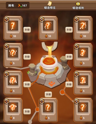 1、锻造炉一共有6个,根据建筑等级解锁相应锻造炉,锻造必要材料石料、木材、锻造石、火种。