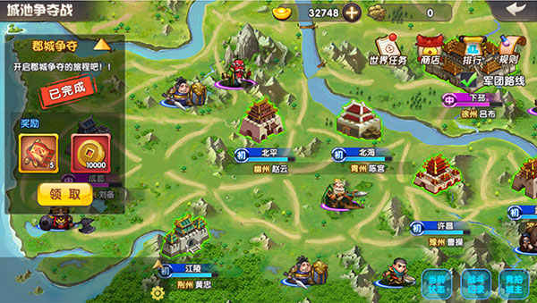 军团之间的城池争夺,占领的城池越多,获得的奖励越丰厚。不过由于有出征时间的限制,出兵之前需要小心敌人前来偷城哟。获得的奖励可以在商店兑换稀有道具和角色。