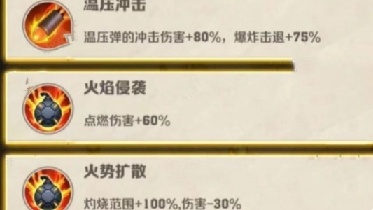 7. 子弹爆炸:当子弹击中怪物时会引发爆炸。这一效果的前提条件是需要温压弹技能。随着枪械研发等级的提升,可以取消这个前提条件。后续的强化包括增加子弹爆炸的伤害和扩大爆炸范围等。根据我的测试,这种爆炸会产生额外的无强化范围伤害(具体公式未知),相当于在对单个目标造成伤害后追加了一个小范围的AOE效果(仅对被命中的单位有效)。值得注意的是,即使子弹已经转变为元素子弹,其产生的范围伤害依旧为物理伤害。强烈推荐使用爆炸效果,因为它能提供真正的AOE伤害。温压弹作为前置技能非常强大,无论是装甲车的焦土策略、空投轰炸的战术核弹、燃油弹的致命爆炸还是无人机的烈焰无人机,都需要以温压弹作为前置技能。在后期关卡中,当需要通过燃烧来触发真实百分比伤害时,温压弹几乎可以说是不可或缺的存在。