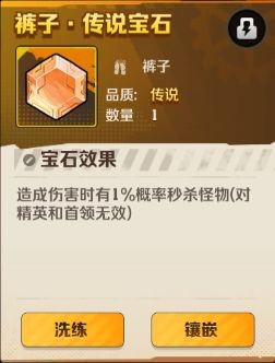 别看触发几率只有百分之一,橙色的秒杀宝石可是萌新能得到的最好宝石了(欧皇一发入魂至尊秒杀除外),只要触发秒杀伤害就比别人多好几个0,我愿称秒杀宝石为萌新平民的顶点,但是注意只有橙色的裤子位置才能出现秒杀哦!