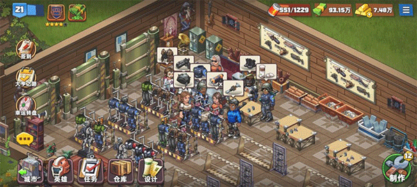 制作:有了员工,在购买相关资源设施之后就可以制造装备啦!装备制作是推动一切发展的唯一动力,根本停不下来。