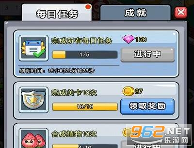 通过完成每天的任务和成就任务,你可以获得金币和紫钻。这些任务主要包括通关一定次数、合成植物若干次以及观看视频若干次,一旦达到指定的数量,就可以领取相应的奖励。