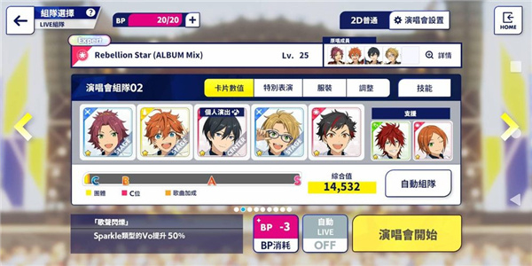 所以资源的分配尤其重要,优先把素材投入5星角,将分数冲高,然后继续打歌获得素材。