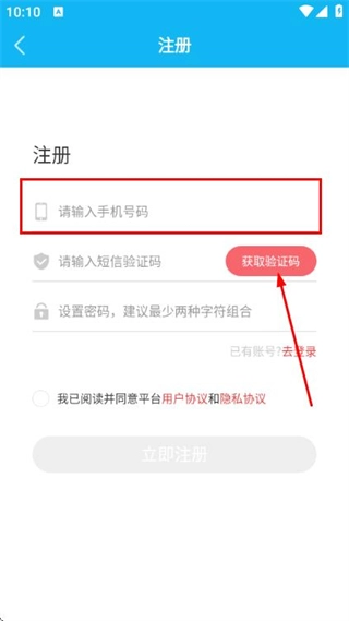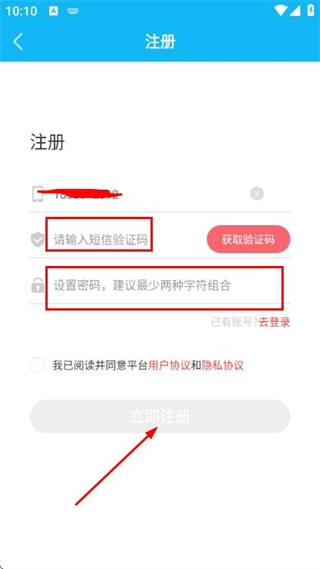 3、在注册页面填写短信验证码和密码,勾选协议后点击立即注册完成账号注册操作。