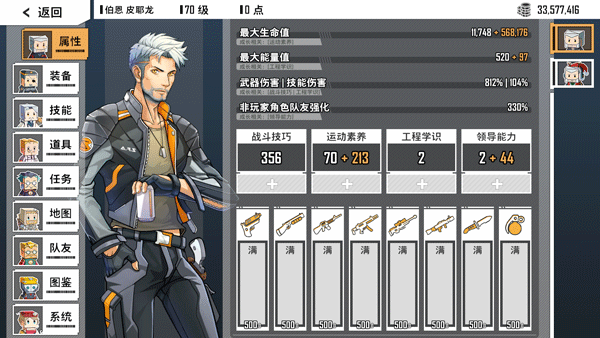 由于版本开发的原因,有些属性的作用不大。每次人物升级时会获得6点属性点,这些点数按照5比1的比例分配:其中5点加到第一项战斗技巧上,这项技能可以大幅提升伤害;剩下的1点则加到第二项运动素养上,虽然提升效果有限,但至少不会轻易被一枪毙命。