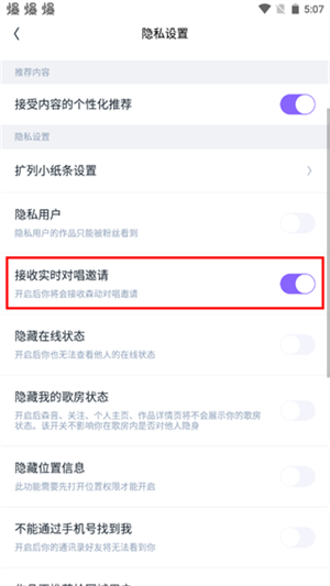 4、选择页面下方【接收实时对唱邀请】选项点击右边按钮开启。